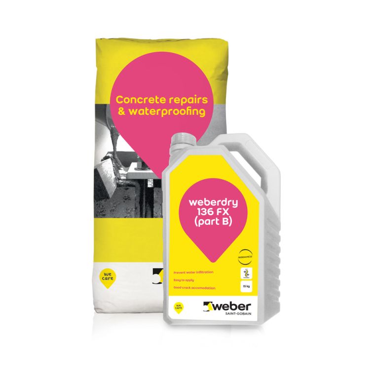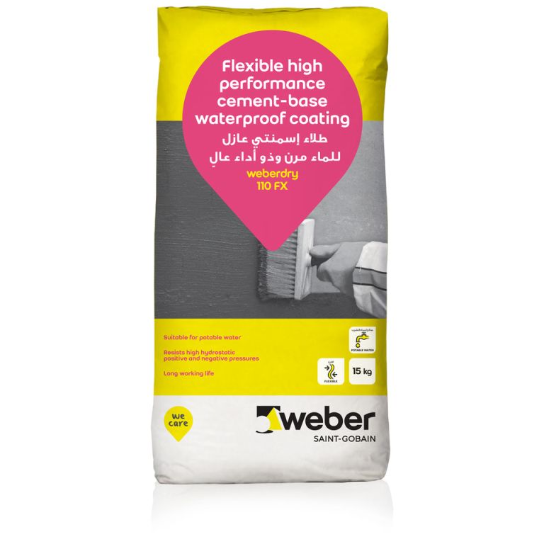 weberdry 110 FX is a two component polymer modified cementitious coating: Powder made of cements, fillers and admixtures. Liquid based on resins and additives. It is available in Grey and White . weberdry 110 FX cures to form an elastomeric, waterproof, flexible and resistant membrane, suitable for use in potable water tanks, reservoirs, canals and tunnels.