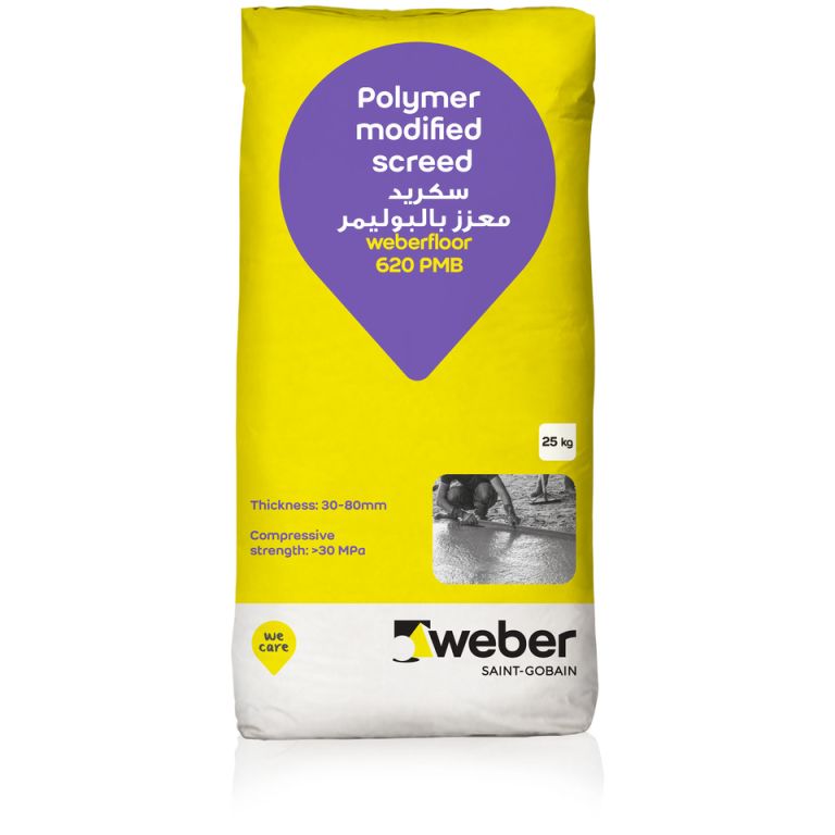 weberfloor 620 PMB is a proprietary polymer modified hydraulic binder which when mixed with sand will give a rapid drying, shrinkage controlled semi-dry floor screed. The resulting screed is ideal for use in all instances in place of traditional semi dry screed, i.e. unbonded, bonded or floating constructions; standard or heated screeds. weberfloor 620 PMB improves the quality, strength and drying speed of the screed over standard cement screeds.