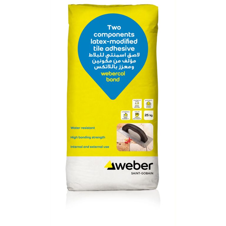 webercol bond is a two component high quality latex-modified mortar glue for fixing tiles. It is made of cement, siliceous fillers, additives and is water resistant.