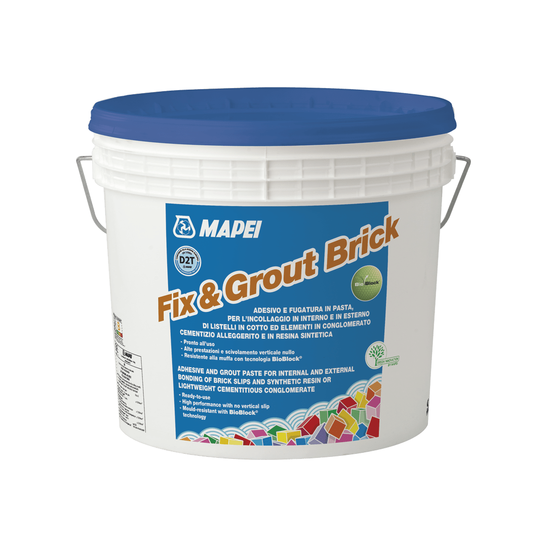 Ready-to-use adhesive paste, interior and exterior bonding and grouting of brick slips and both large and small-sized lightweight cementitious and resin conglomerate decorative elements on all types of traditional substrates: