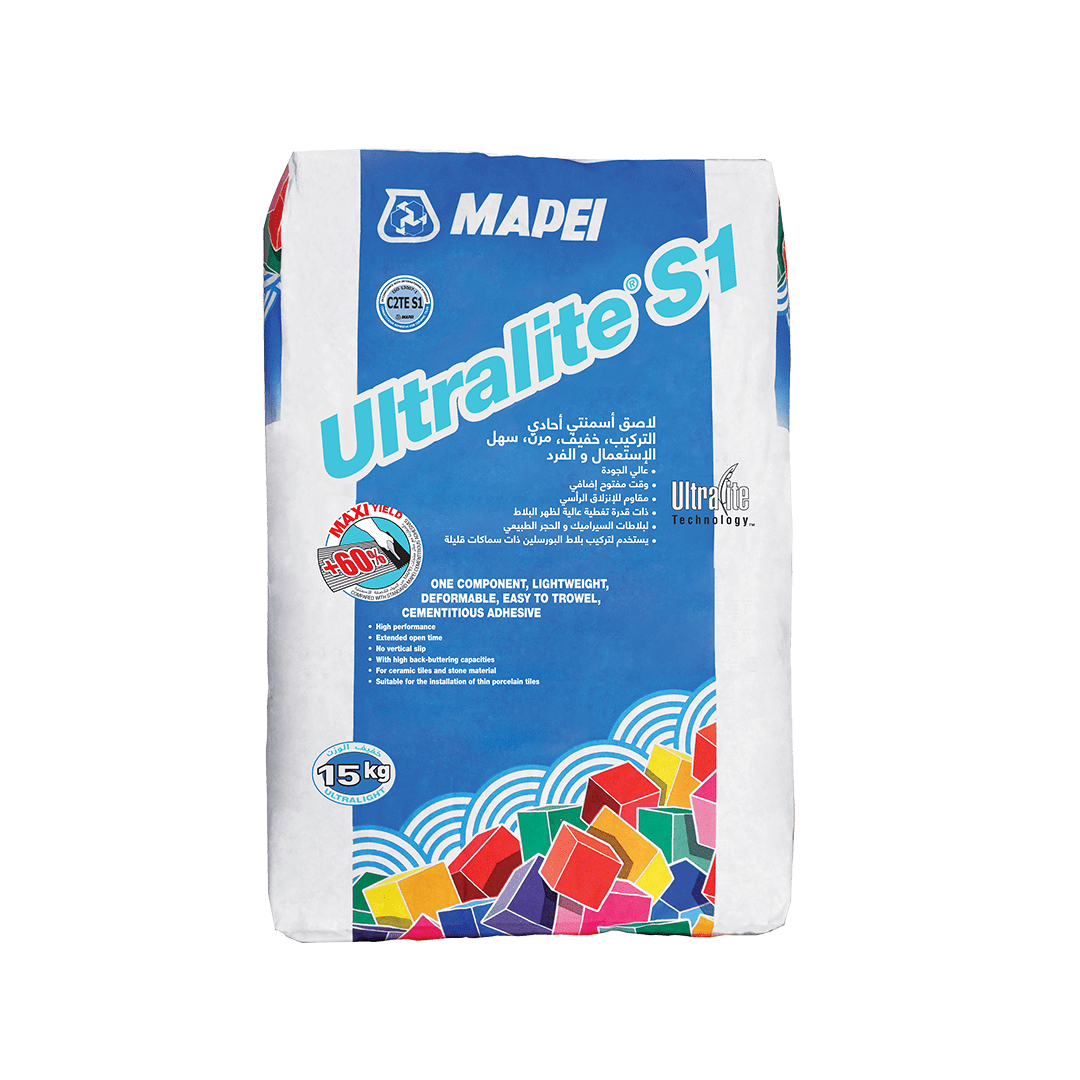 One-component, high-performance, deformable, lightweight cementitious adhesive with no vertical slip, long open time and extremely high yield easy to apply by trowel, for ceramic tiles and stone material.