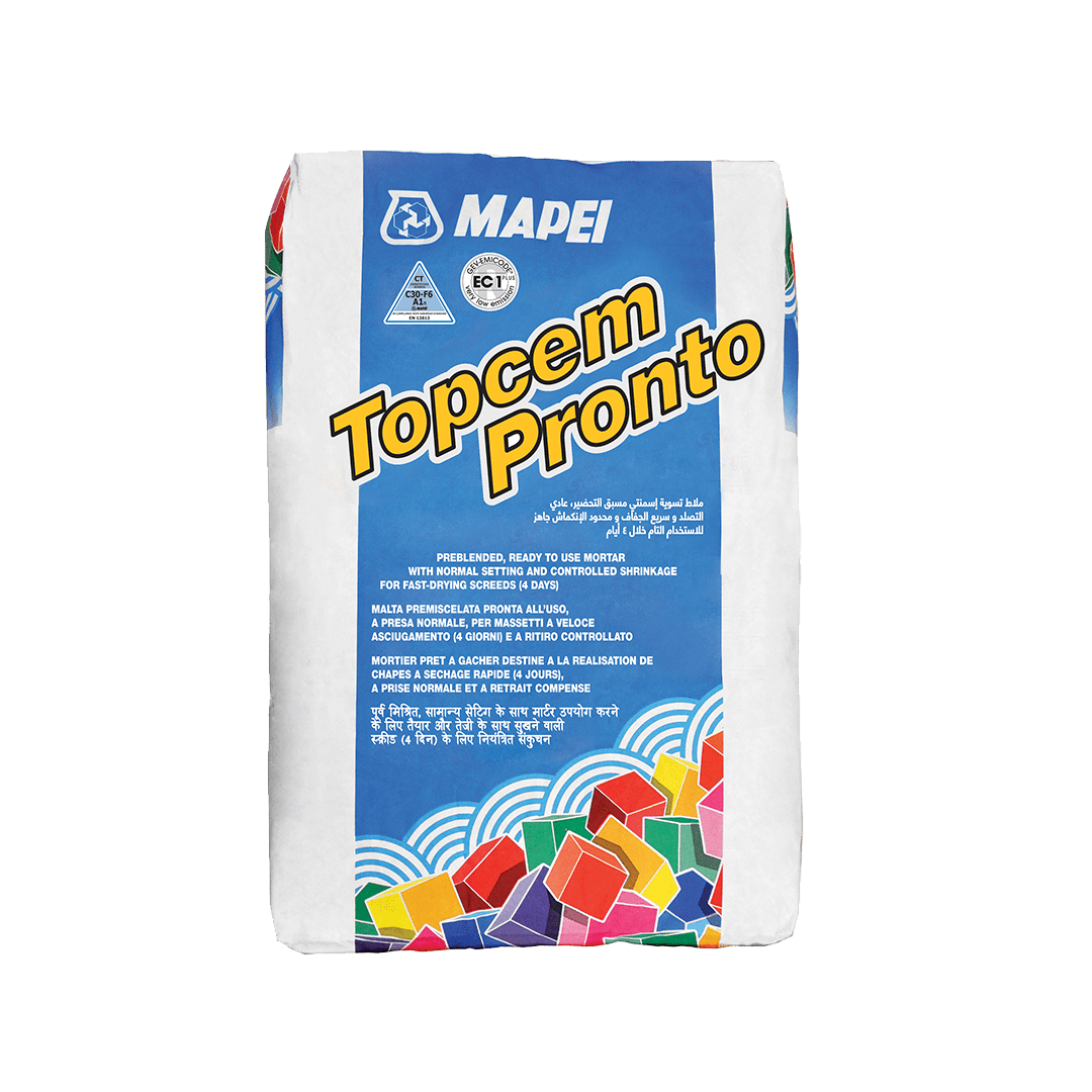 Bonded screeds and patching (less than 35 mm thicknesses) first require the application of a Topcem and Planicrete anchoring slurry. For floating screeds (thicknesses above 35 mm) lay a polyethylene sheet beforehand.